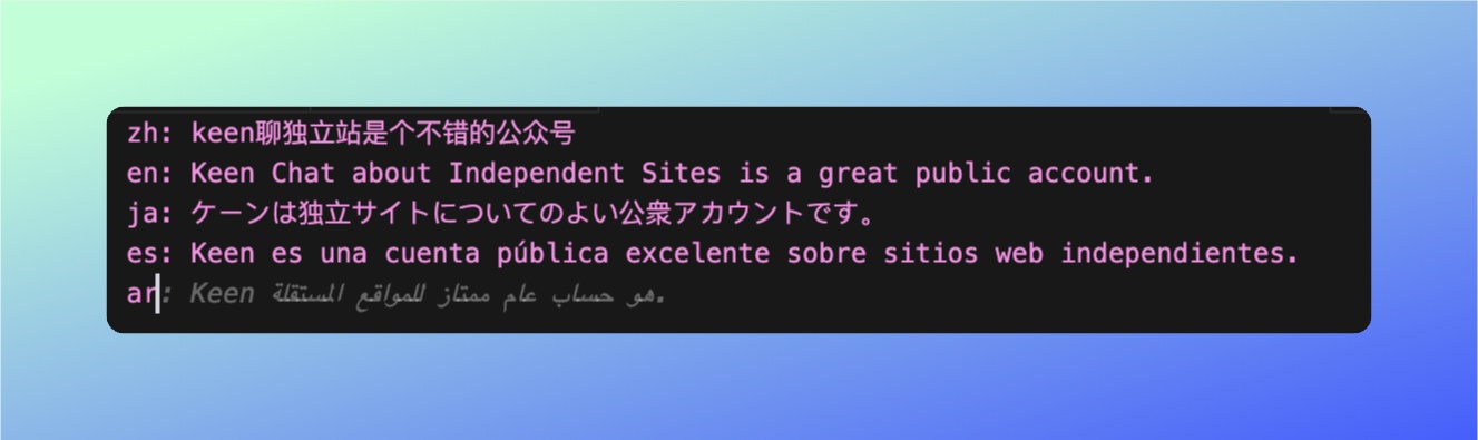 接着在第二行我输入「en:」,然后你只需要按一下键盘的tab键,接下来就是自动翻译了,同理,输入ja/es/ar,这些语言就全部都给你翻译好了。 cursor这个功能,我特别喜欢用,我问了下AI,这个功能是基于模糊识别、上下文理解、机器学习自动生成的,利用这个功能,我们可以快速给自己的网站翻译多语言了。 不过,同时cursor「模糊识别」翻译精度还是没有AI翻译的精确,如果是简单的产品翻译,自己又懂多语言的话,可以用这个应急快速测试,如果是大批量需要高精度的翻译,还是建议采用gpt/claude提问,操作也很简单,把多语言标签粘贴到对话框,让AI帮你填充。