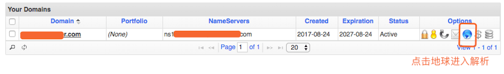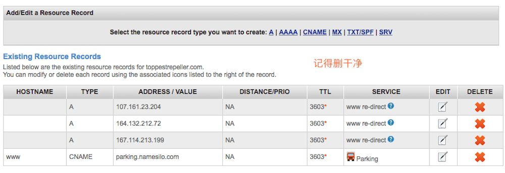 点击地球图标进入解析界面,值得注意的是,Namesilo会自带一些解析,要记得全部删除掉!