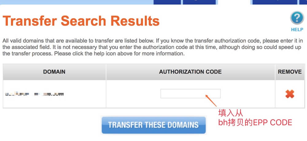 输入需要转移的域名后出现EPP CODE填写框:
