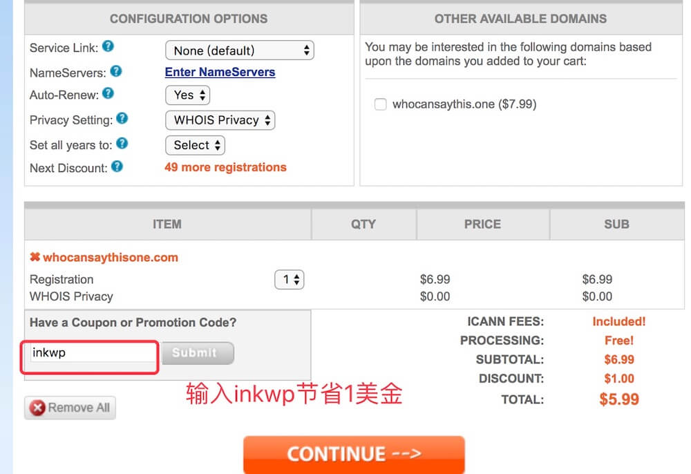 进入购物车后,将Privacy setting设置为Whois privacy,这样是保护自己的域名注册信息不泄漏,另外可以在coupon中输入keen或者inkwp能免费1美金,这个免费只支持购买域名一年。