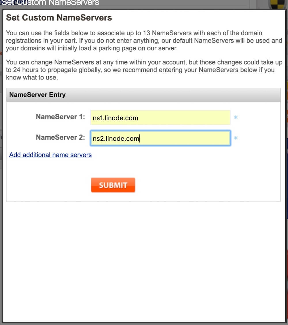 选中要买的域名,进到购物车页面:-NameServers建议设置成主机的DNS,例如你的主机在Linode,可以将NameServers设置成ns1.linode.com和ns2.linode.com