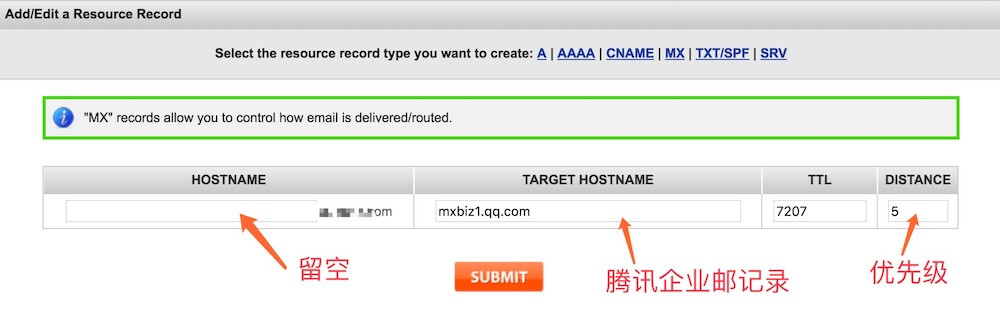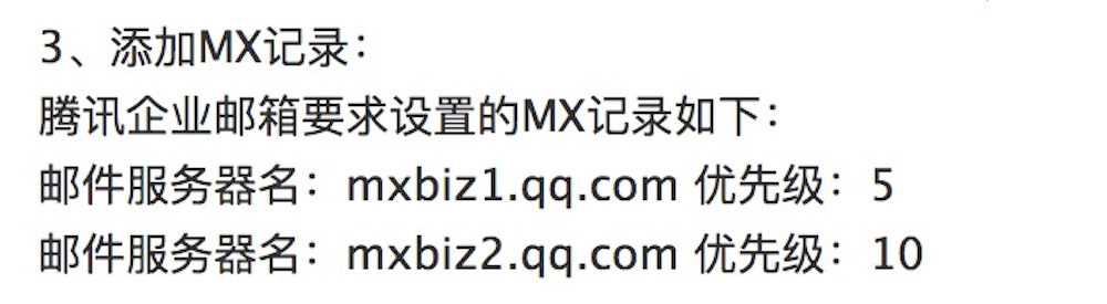 从腾讯企业邮官网找到需要添加的记录mxbiz1.qq.com和mxbiz2.qq.com,