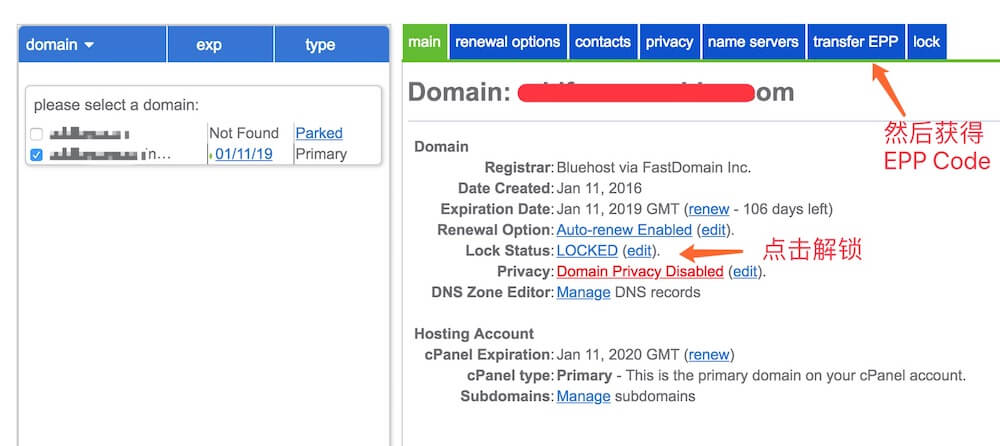 bh上的域名需要解锁,解锁后点击transfer EPP,然后拷贝EPP CODE一串代码。