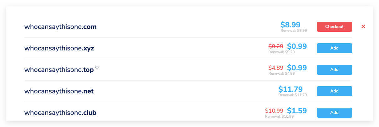 显示的结果中,如果域名可以购买,就直接点击Add加入购物车,然后点击checkout