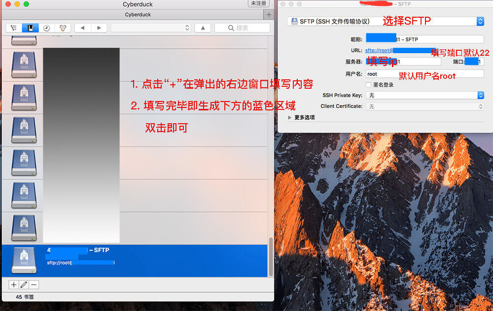 下载后双击打开鸭子,在弹窗的窗口左下角点击加号,弹出了新的窗口,如下图的右侧小窗口,以此填写后点击关闭,左边的大窗口下方会出现一个新增的栏目,双击之后填写密码即可。