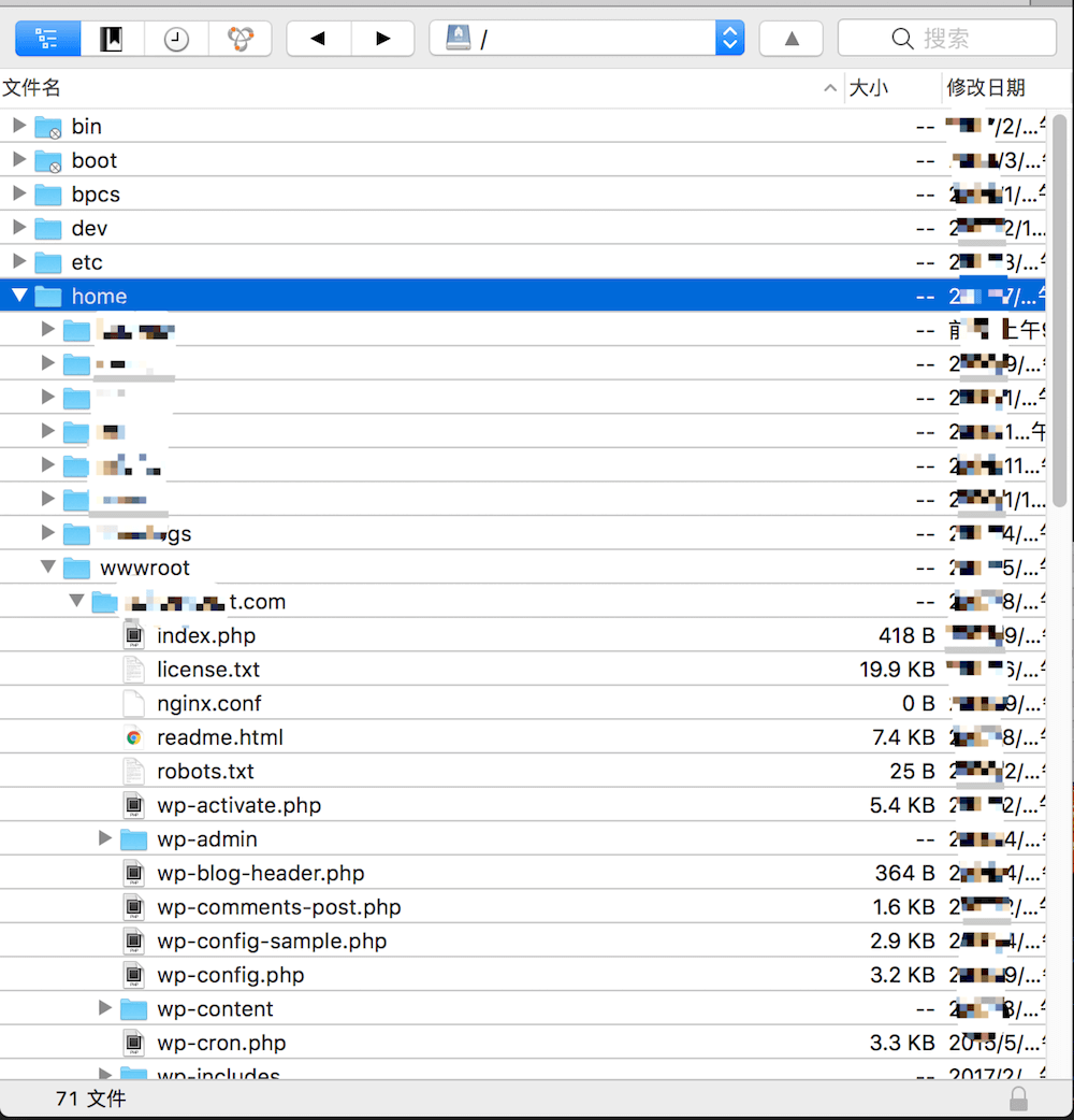 一般安装的网站都在home-wwwroot下面,双击进到对应页面就行了,这个FTP是单页的,操作过Mac的同学应该不陌生了,有什么文件直接拖拽进去就行了。