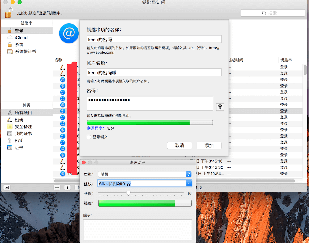 弹出后点击新增+,钥匙串名称起一个相关的,例如「linode登录账号」,然后账户名称填写登录账户名,密码这里可以点击右边的「钥匙」出现「密码助理」下拉框,「类型」选择随机,长度16,然后点击「添加」。