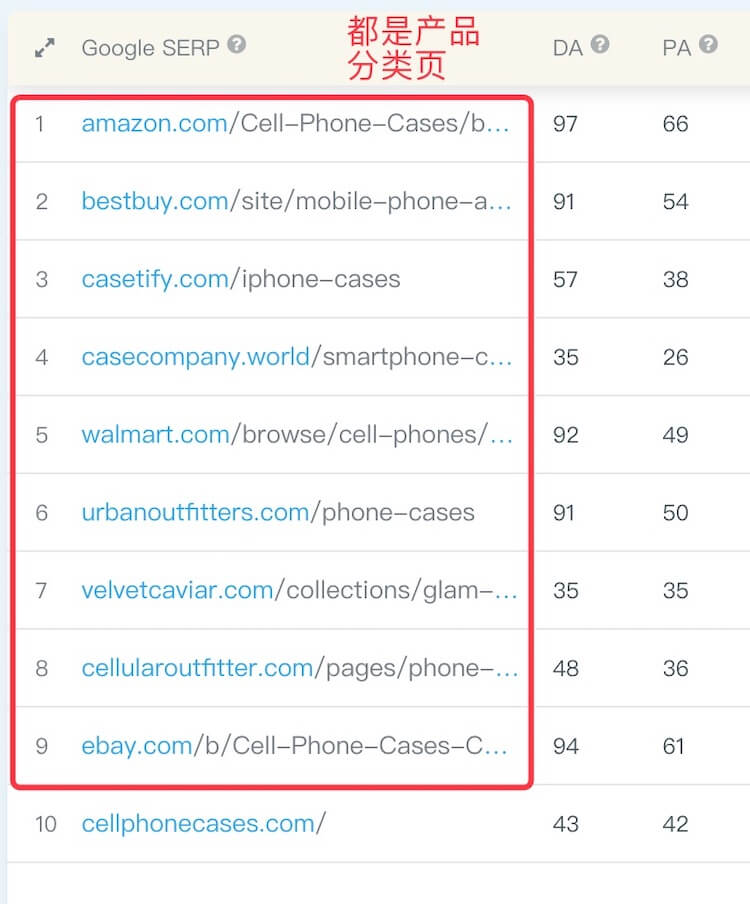 我们在谷歌搜索”Phone case”看到前九的页面都是产品分类页
