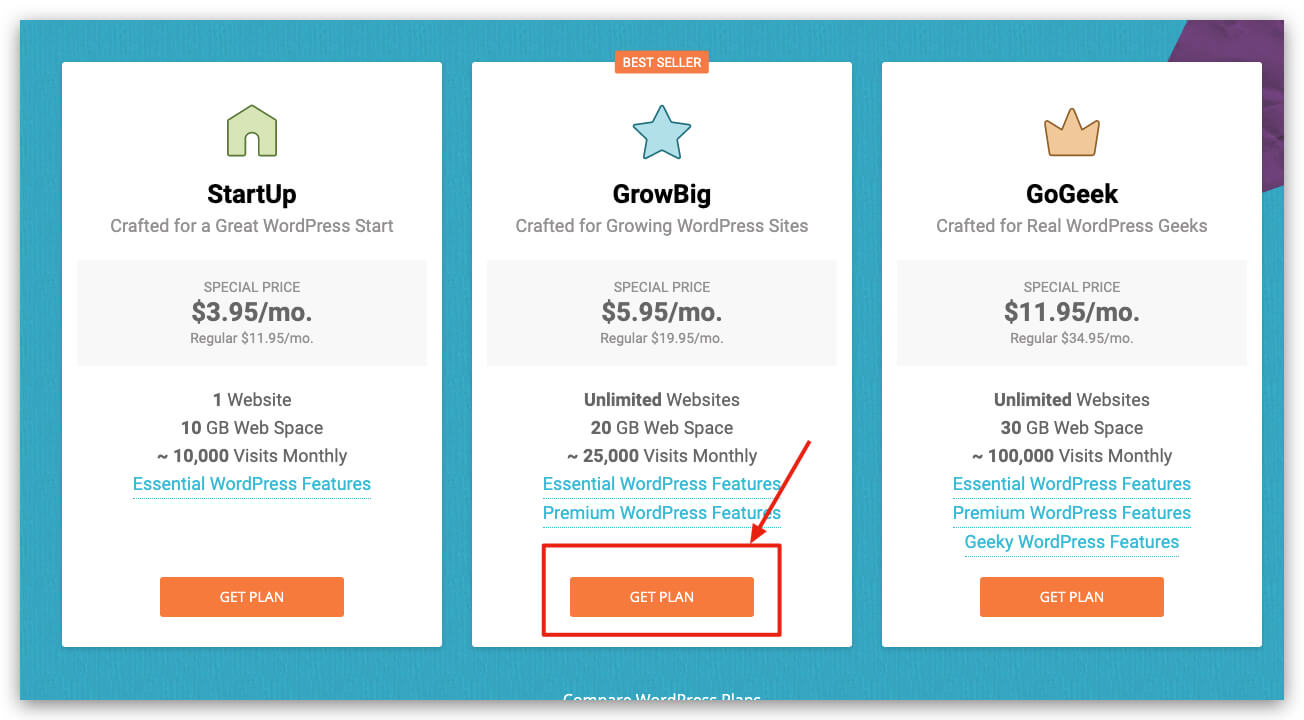我们选择5.95美金/月套餐,这个套餐的好处是可以放置多个网站,为后面拓展新的网站留下空间,点击get plan进入下一步