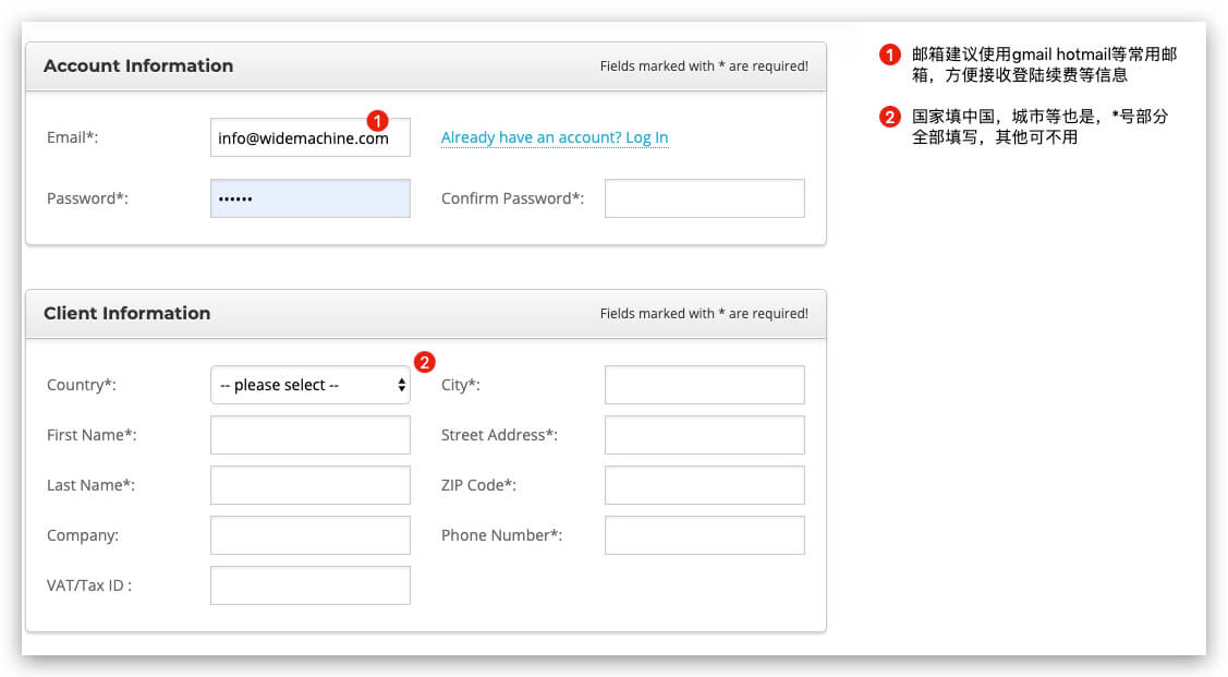基本信息这里我们要填一下用户后面登陆的账号密码以及购买的国家地图,邮件建议用gmail hotmail,方便快速接收邮箱,另外建议使用常用邮箱,以后续费等信息能及时查看到,忘了续费网站关闭的案例在我这里有很多哦,都是血与泪的教训啊