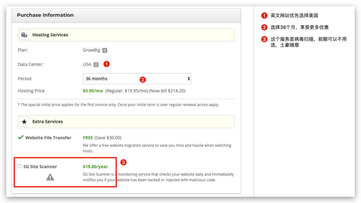 至于extra services中的sg site scanner,暂时不用购买,这个是用来扫描网站病毒的,后面再购买也许,当然土豪随意哦