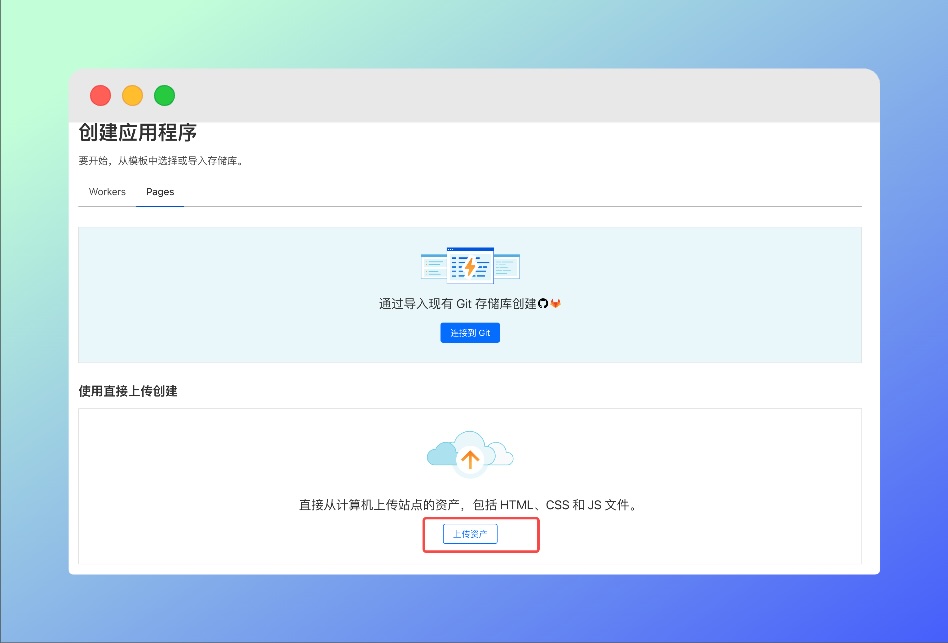 点击pages的tab,然后找到下面的「上传资产」,上传写好的html文档,如果文档很多,那么就把整个html打包成zip文档。