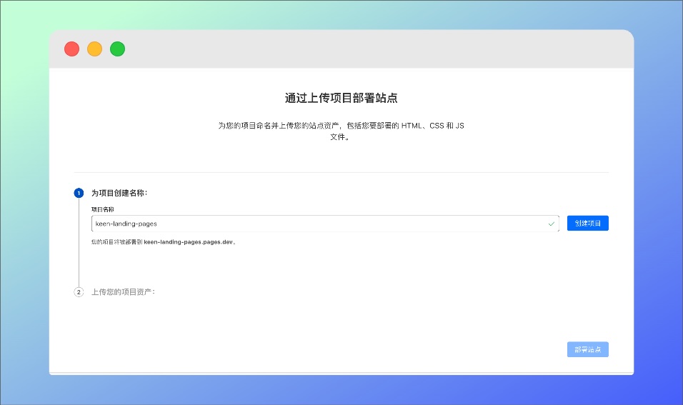 然后给你的项目取一个名字,比如我取名叫keen-landing-page,创建项目,部署站点