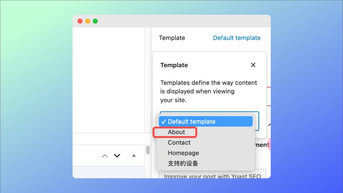 然后在wp后台新建page,找到Template,下拉选择About,名字跟你的Template Name一致即可。